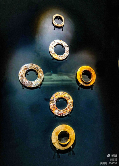 璧圓形像天蓋,是“禮天”法器。金沙出土玉璧200余件,形制分有領(lǐng)與無領(lǐng)兩種,有領(lǐng)的玉璧圓孔周緣凸起。