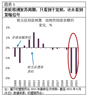第四,到目前為止,還沒(méi)有聽(tīng)到過(guò)有人提財(cái)政緊縮。還記得歐央行前行長(zhǎng)馬里奧·德拉吉(Mario Draghi)在全球金融危機(jī)結(jié)束后就討論降低財(cái)政赤字。而且他的前任,讓-克洛德·特里謝(Jean-Claude Trichet)在2011年兩次上調(diào)利率,從1.0%提高到1.5%。