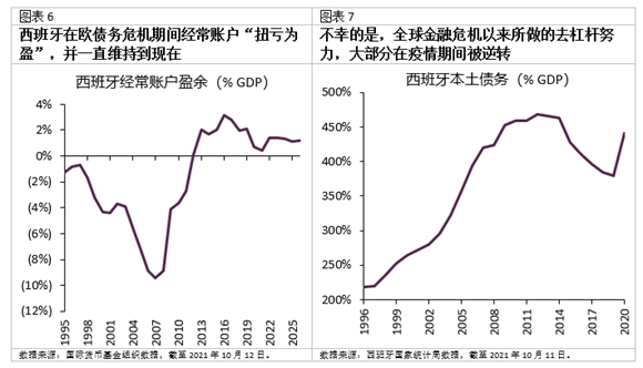 第五,雖然歐洲在疫后背負(fù)了更多債務(wù),但經(jīng)濟(jì)也更具競(jìng)爭(zhēng)力。圖表6顯示西班牙的經(jīng)常賬戶仍然盈余。而2008年全球金融危機(jī)之后,其銀行的資本金和出口競(jìng)爭(zhēng)力都很糟糕。
