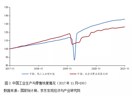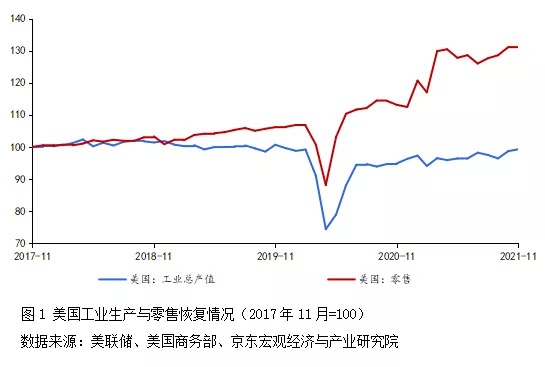 疫情以來(lái)美國(guó)等發(fā)達(dá)經(jīng)濟(jì)體紛紛踐行MMT政策,供給修復(fù)顯著慢于需求。拜登政府大規(guī)模實(shí)施財(cái)政赤字貨幣化,依靠“直升機(jī)撒錢”強(qiáng)力刺激需求側(cè),對(duì)經(jīng)濟(jì)復(fù)蘇起到了積極作用,但也導(dǎo)致復(fù)蘇結(jié)構(gòu)極不均衡,突出表現(xiàn)為供給側(cè)恢復(fù)滯后(見(jiàn)圖1)。2021年美國(guó)零售超預(yù)期上漲,截至2021年11月已達(dá)到2017年11月水平的131.3%,顯著超過(guò)疫情之前;供給側(cè)恢復(fù)則顯著滯后,在疫情反復(fù)延緩復(fù)工復(fù)產(chǎn)、港口貨物處理能力有限推動(dòng)運(yùn)價(jià)飆升、原材料短缺等因素影響下,制造業(yè)產(chǎn)能始終無(wú)法完全釋放,截至2021年11月美國(guó)工業(yè)總產(chǎn)值仍不及疫情前水平。
