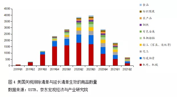 疫情以來(lái)美國(guó)對(duì)中國(guó)制造的依賴,并非加征關(guān)稅等因素可以扭轉(zhuǎn)。中國(guó)海關(guān)數(shù)據(jù)顯示,疫情以來(lái)美國(guó)對(duì)中國(guó)機(jī)電、機(jī)械、中間品等進(jìn)口依賴度有所提升。2020年前11個(gè)月中國(guó)對(duì)美出口構(gòu)成中,機(jī)電、機(jī)械類商品份額高達(dá)43%,塑料橡膠、車輛船舶、玻璃陶瓷、化工產(chǎn)品等中間品份額較疫情前(2019年)水平均有抬升。美國(guó)對(duì)關(guān)稅排除商品的選擇也印證了這一點(diǎn),2019年至2021年5月美國(guó)陸續(xù)公布33批關(guān)稅排除清單,其中機(jī)電產(chǎn)品、機(jī)械設(shè)備占全部近2000種商品數(shù)量的比重接近一半(見(jiàn)圖4)。美國(guó)國(guó)際貿(mào)易委員會(huì)(USITC)的數(shù)據(jù)測(cè)算結(jié)果顯示,2020年以來(lái)中國(guó)4批關(guān)稅清單商品對(duì)美出口金額均顯著修復(fù),加征關(guān)稅對(duì)中國(guó)出口的影響已大幅降低。