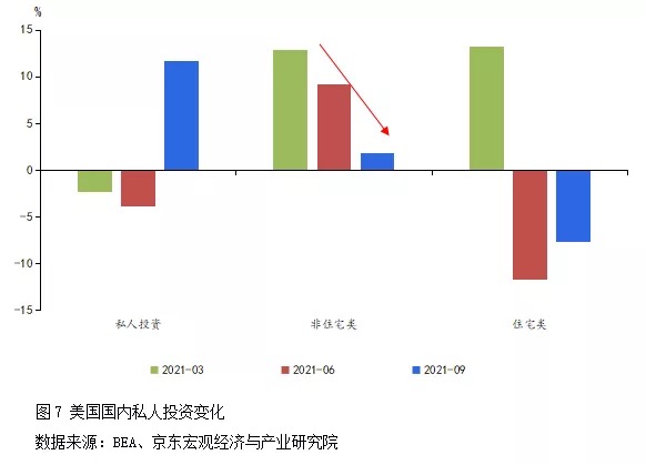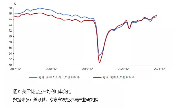 二是生產(chǎn)端修復(fù)仍然滯后。2021年12月美國(guó)制造業(yè)產(chǎn)能利用率剛剛接近疫情前水平(見(jiàn)圖6),但近期奧密克戎新毒株已開始大流行,疊加勞動(dòng)率短缺,為復(fù)工復(fù)產(chǎn)再次帶來(lái)不確定性。原材料漲價(jià)正持續(xù)壓縮下游行業(yè)利潤(rùn),美股2021年三季報(bào)數(shù)據(jù)顯示,能源、金屬等大宗價(jià)格大幅抬升之下,原材料、公用事業(yè)(電力等)等行業(yè)凈資產(chǎn)收益率(ROE)水平較疫情前明顯提升,下游工業(yè)、消費(fèi)品行業(yè)的利潤(rùn)空間被明顯打壓。制造業(yè)投資也處于低位,2021年三季度末,反映企業(yè)投資狀況的非住宅類固定資產(chǎn)投資環(huán)比折年率僅為1.8%(見(jiàn)圖7),較上期大幅下滑,投資恢復(fù)緩慢對(duì)制造業(yè)擴(kuò)大產(chǎn)能形成制約。此外,全球缺芯仍將拖累汽車產(chǎn)業(yè)鏈。國(guó)際半導(dǎo)體產(chǎn)業(yè)協(xié)會(huì)(SEMI)和國(guó)際信息技術(shù)服務(wù)公司Gartner的數(shù)據(jù)顯示,截至2021年第四季度,全球晶圓廠產(chǎn)能利用率已達(dá)到92%,接近飽和,芯片擴(kuò)產(chǎn)能周期在1—2年左右,本輪芯片短缺可能持續(xù)至2022年第二季度。
