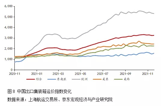 三是運(yùn)輸瓶頸解決仍須時(shí)日。國(guó)際運(yùn)輸方面,長(zhǎng)灘港和洛杉磯港合計(jì)約占美國(guó)海運(yùn)集裝箱吞吐量的40%,但疫情以來(lái)上述兩個(gè)港口運(yùn)營(yíng)效率低下,2021年11月洛杉磯港出口空箱比仍高達(dá)77%,平均輪班在港時(shí)間依然超10天;受此影響2021年以來(lái)美西航線與美東航線的中國(guó)出口集裝箱運(yùn)價(jià)指數(shù)價(jià)格(CCFI)持續(xù)高位運(yùn)行(見(jiàn)圖8)。國(guó)內(nèi)運(yùn)輸方面,根據(jù)美國(guó)卡車運(yùn)輸協(xié)會(huì)2021年11月預(yù)測(cè),當(dāng)前美國(guó)卡車司機(jī)欠缺數(shù)量比新冠疫情前增加了30%,缺口達(dá)8萬(wàn)人,司機(jī)短缺也制約運(yùn)輸瓶頸的解決。
