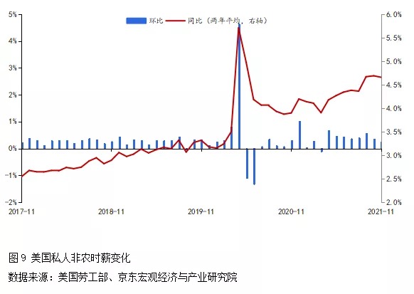 六大因素將推動(dòng)美國(guó)通脹繼續(xù)保持高位。一是歐美貨幣政策正常化進(jìn)程滯后,極度寬松的貨幣政策仍將持續(xù)。二是產(chǎn)出缺口仍然存在,供不應(yīng)求引發(fā)價(jià)格上漲壓力,供需方面的不匹配短期之內(nèi)難以緩解。三是工資上漲過(guò)快。在勞動(dòng)力短缺之下,2021年11月美國(guó)私人非農(nóng)時(shí)薪兩年平均同比增長(zhǎng)4.7%(見(jiàn)圖9),其中休閑酒店業(yè)、專業(yè)商業(yè)服務(wù)、倉(cāng)儲(chǔ)運(yùn)輸?shù)刃袠I(yè)漲幅排名靠前。四是能源短缺。全球推動(dòng)碳中和戰(zhàn)略導(dǎo)致供需矛盾,決定了能源價(jià)格在相當(dāng)長(zhǎng)的時(shí)期內(nèi)仍有動(dòng)力保持高位,美國(guó)2021年11月CPI能源分項(xiàng)大幅走高,同比上漲33%。五是美國(guó)樓市熱度較高。房貸利率寬松、居民部門杠桿率不高、補(bǔ)庫(kù)存需求旺盛和企業(yè)樂(lè)觀預(yù)期,將共同支撐2022年美國(guó)房?jī)r(jià)與房租保持在較高水平。六是輸入性通脹。疫情暴發(fā)后,美國(guó)自各經(jīng)濟(jì)體進(jìn)口制成品價(jià)格明顯攀升;與2020年初相比,當(dāng)前各經(jīng)濟(jì)體制成品價(jià)格大多漲幅在3%—8%之間,其中加拿大更是上漲15%。