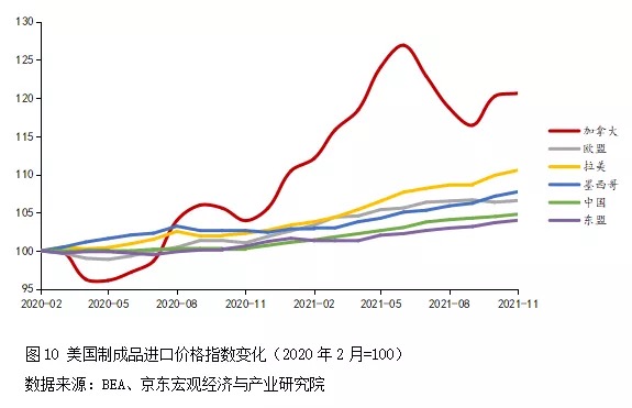 加大對(duì)中國(guó)進(jìn)口力度有助于美國(guó)平抑價(jià)格水平。從美國(guó)主要進(jìn)口來(lái)源地的制成品進(jìn)口價(jià)格指數(shù)來(lái)看,中國(guó)在美國(guó)加征關(guān)稅的情況下,商品價(jià)格上漲幅度仍顯著低于加拿大、拉美、墨西哥、歐洲(見(jiàn)圖10)。這意味著美國(guó)加大自中國(guó)進(jìn)口,對(duì)其抑制國(guó)內(nèi)通脹將產(chǎn)生顯著的正向貢獻(xiàn)。