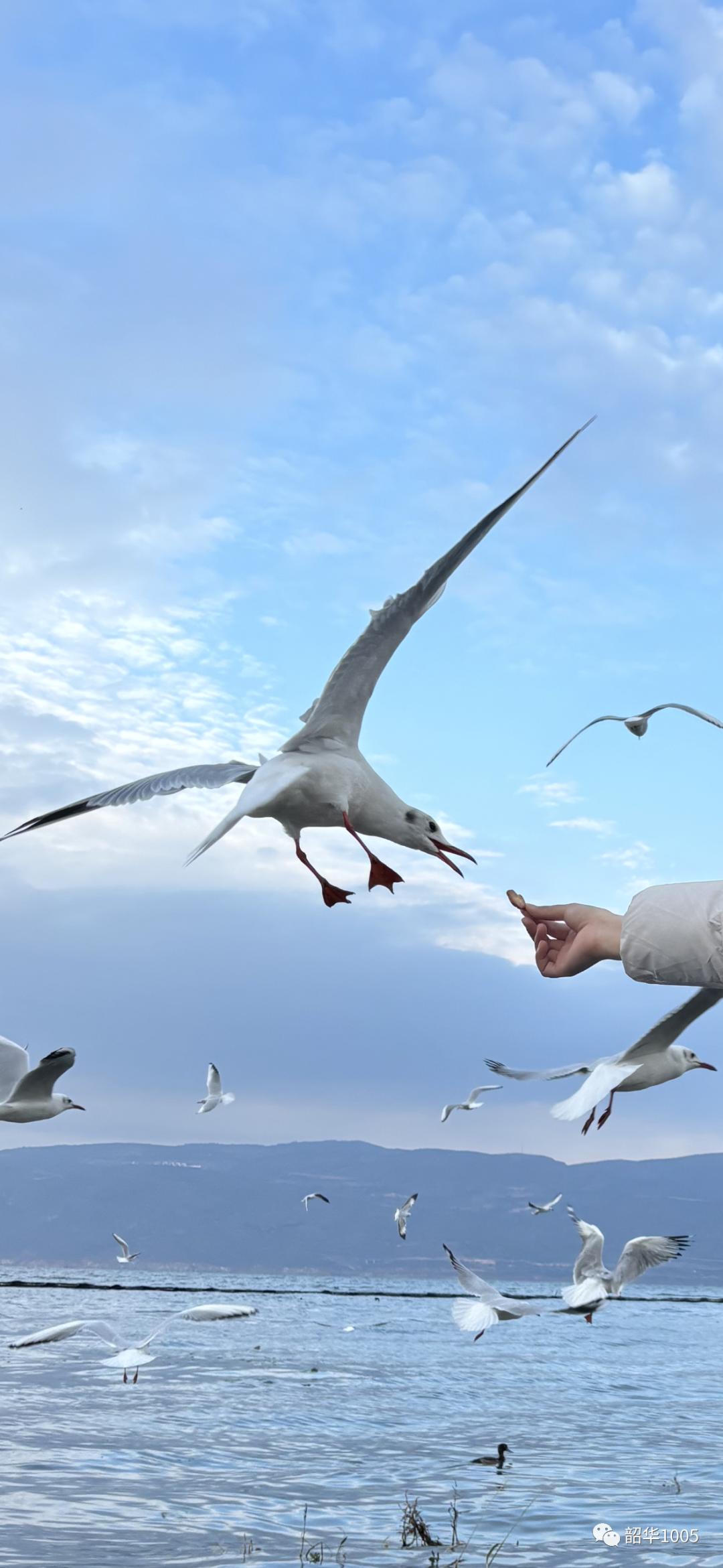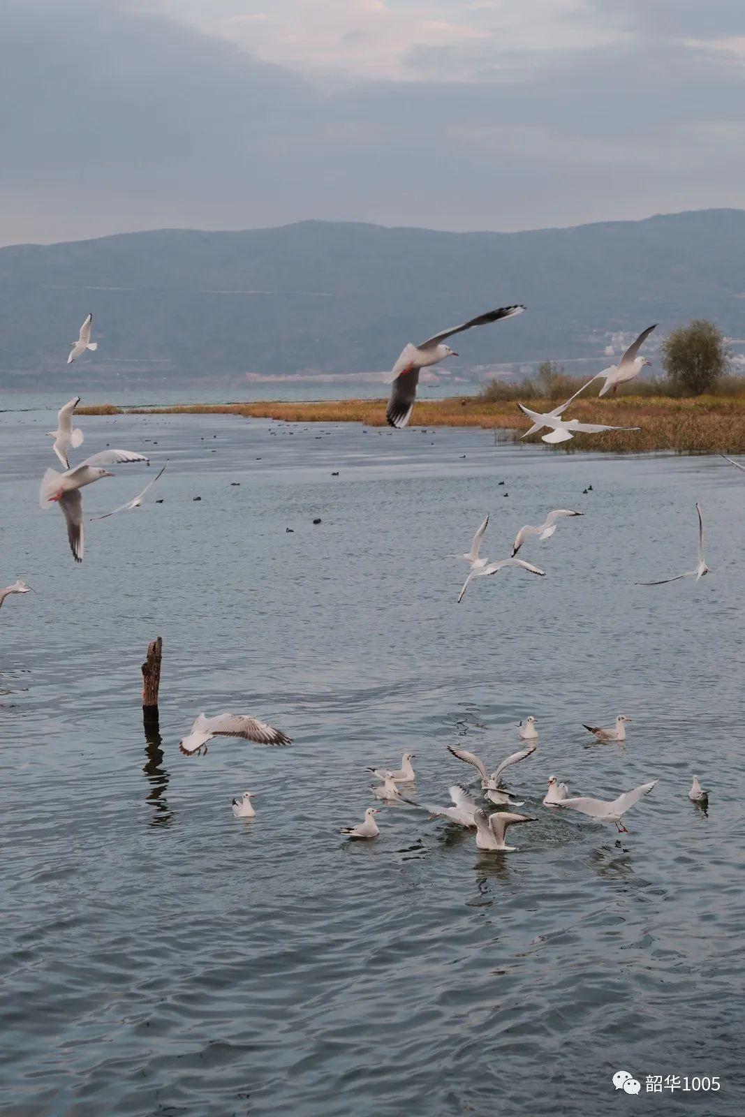 從西伯利亞如約而至的海鷗是大理的重要貴賓,冬季洱海一道唯美亮麗的風(fēng)景線。這群可愛(ài)的小精靈,伴隨游客的歡笑聲、尖叫聲時(shí)而匯聚成一片,時(shí)而展翅飛翔,時(shí)而低飛盤(pán)旋掠食,時(shí)而水面嬉戲追逐……紅色尖長(zhǎng)的嘴巴,潔白晶瑩的羽毛,清脆高亢的叫聲時(shí)刻撩動(dòng)著游客的心扉,甚是討人歡喜!還有三五成群的野鴨在悠然自得地覓食……給冬日的洱海平添了幾分盎然的情趣……