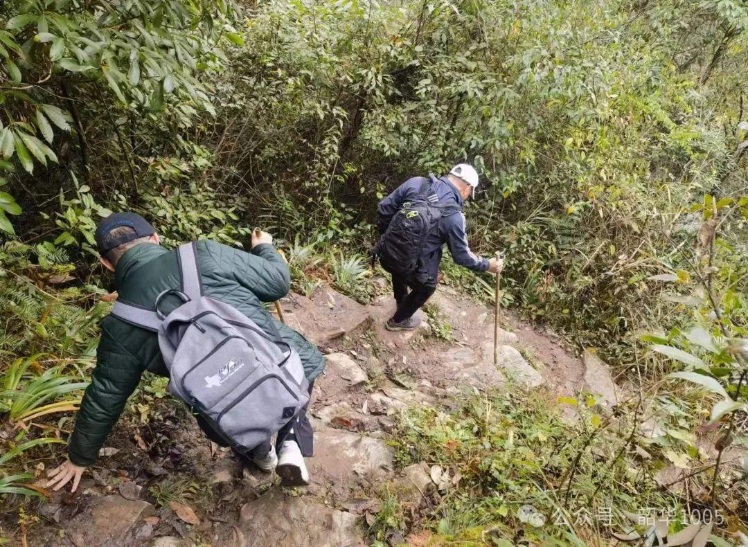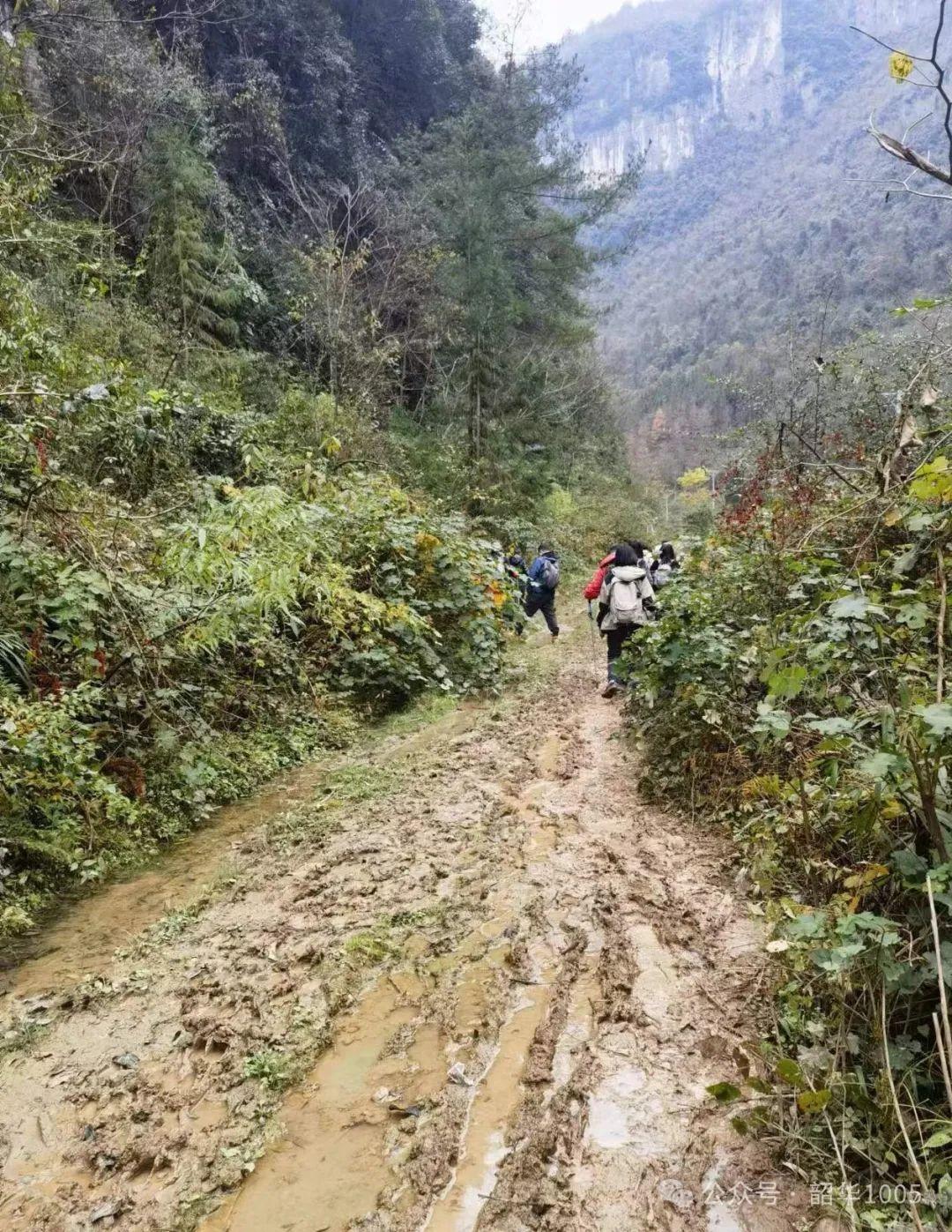從入口處開始,我們便走上了一條僅容一人行走的煉獄級崎嶇山路,可能是剛下過雨的緣故,“之”字形羊腸小徑迂回曲折、泥濘坑洼,滿是泥槳水坑。我們不得不彎腰、低頭、側(cè)身,竹棍開路,左躲右閃,小心翼翼地邁腿抬腳慢慢地一步步往下探,深一腳淺一腳,此時什么風(fēng)景都是“浮云”,安全才是第一!