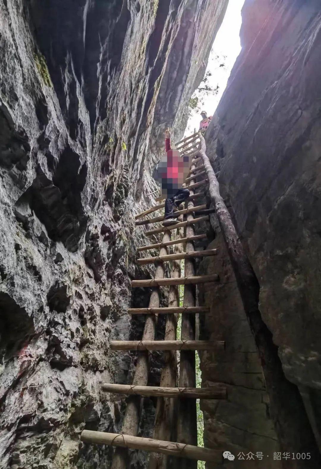 爬完好漢坡之后全程“輕舟已過萬重山”,將到達(dá)此行的最后一站——一線天。一線天是條直上直下的天然地縫,只有一架簡陋的木梯子卡在巖縫里,勉強(qiáng)能容一個人上下,“驢友們”均是靠這把梯子才能走出清江古河床,我們自然不能例外!