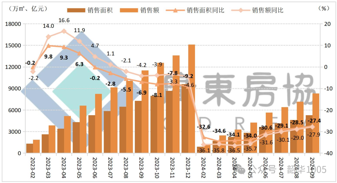 據統計局數據,前三季度廣東新建商品房銷售面積5302萬平方米,銷售額8310億元,同比下降27.4%和27.9%,降幅比上半年縮窄3.2個和3.7個百分點,降幅連續(xù)5個月小幅收窄。其中商品住宅銷售面積4131萬平方米,銷售額7185億元,同比下降30.8%和28.3%,降幅比上半年縮窄5.1個和5.0個百分點。