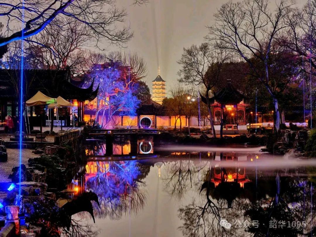 “拙政問雅”之妙妙在“雅”!有別于白天的“趕鴨式”,少了許多熙熙攘攘、行色匆匆的游客,更沒有聒聒噪噪的吵鬧,在朦朧夜色和五彩光影的映襯烘托下,或亮或暗,或紅或藍或綠或黃……絢麗多姿,讓這座500多年的古典園林又煥發(fā)了新活力,充滿著神秘的清幽和高雅的浪漫,如古江南文人墨客般三五知已秉燭游耍在自家庭院一樣輕松愜意!