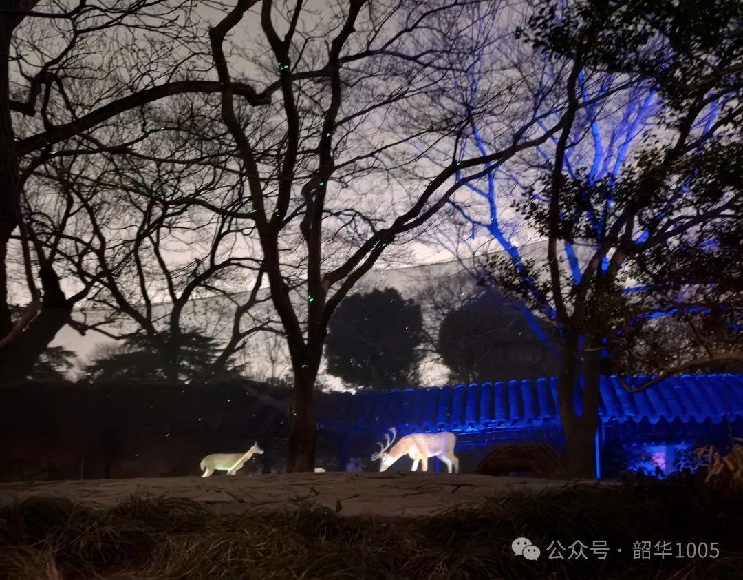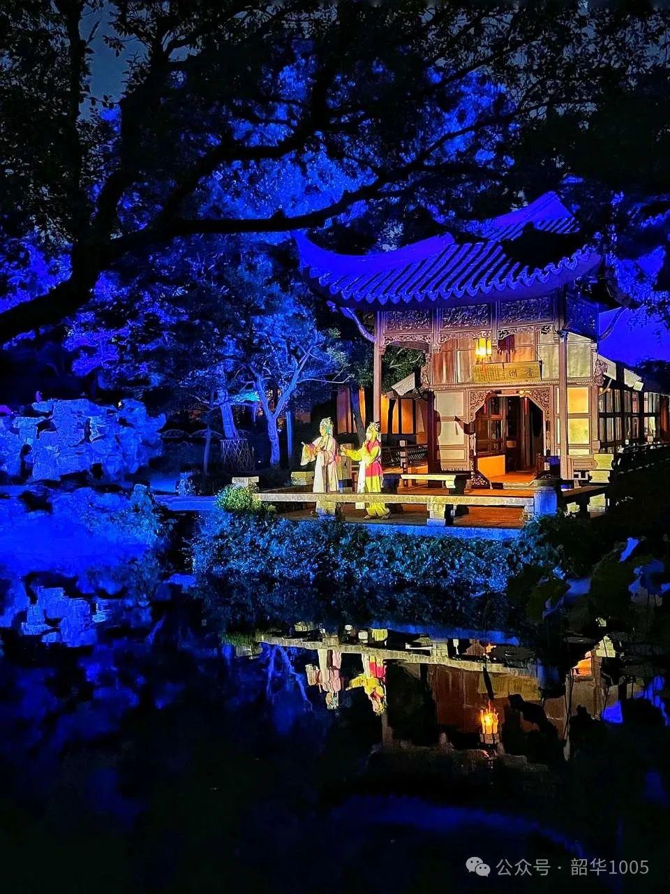 北墻竹林綠光點點、見山樓太平天國忠王李秀成書房內(nèi)燈火通明、飛檐翹角輪廊分明、山坡上鹿鳴呦呦,“遠香堂”外“小飛虹”廊橋彩虹飛架,惟妙惟肖,驚艷的不禁讓人呆住了……“荷風四面亭”南面是拙政園首創(chuàng)的船形建筑“香洲”,船頭上嬌艷可人的“杜麗娘和丫鬟春香”正可勁地演唱著昆典名劇《牡丹亭》,雖然我一句也不曾聽懂,但能在500年的庭院中感受一下400年的昆曲,與古人來個時空交錯也是別有一番情趣,如夢似幻的!