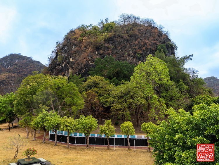 黃巖洞位于大斑石與十里畫(huà)廊之間,是三疊紀(jì)(距今2.5~2億年的地質(zhì)時(shí)代)石灰?guī)r孤峰,背后峰叢起伏。