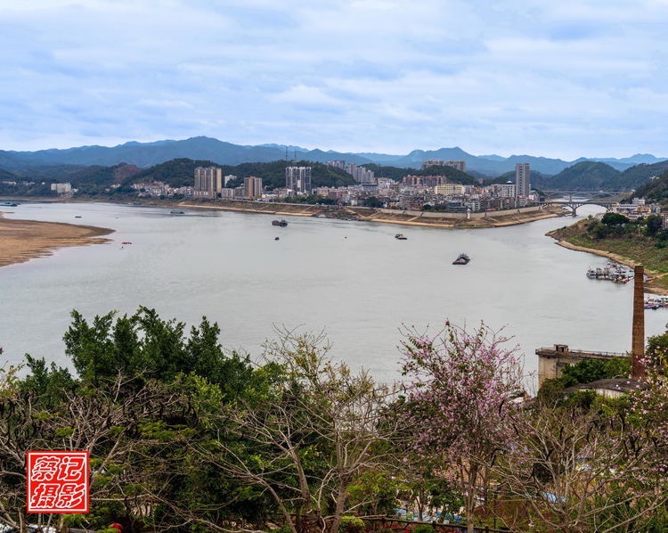 江水緩流,遠(yuǎn)山秀美;兩岸青翠,春花怒放。